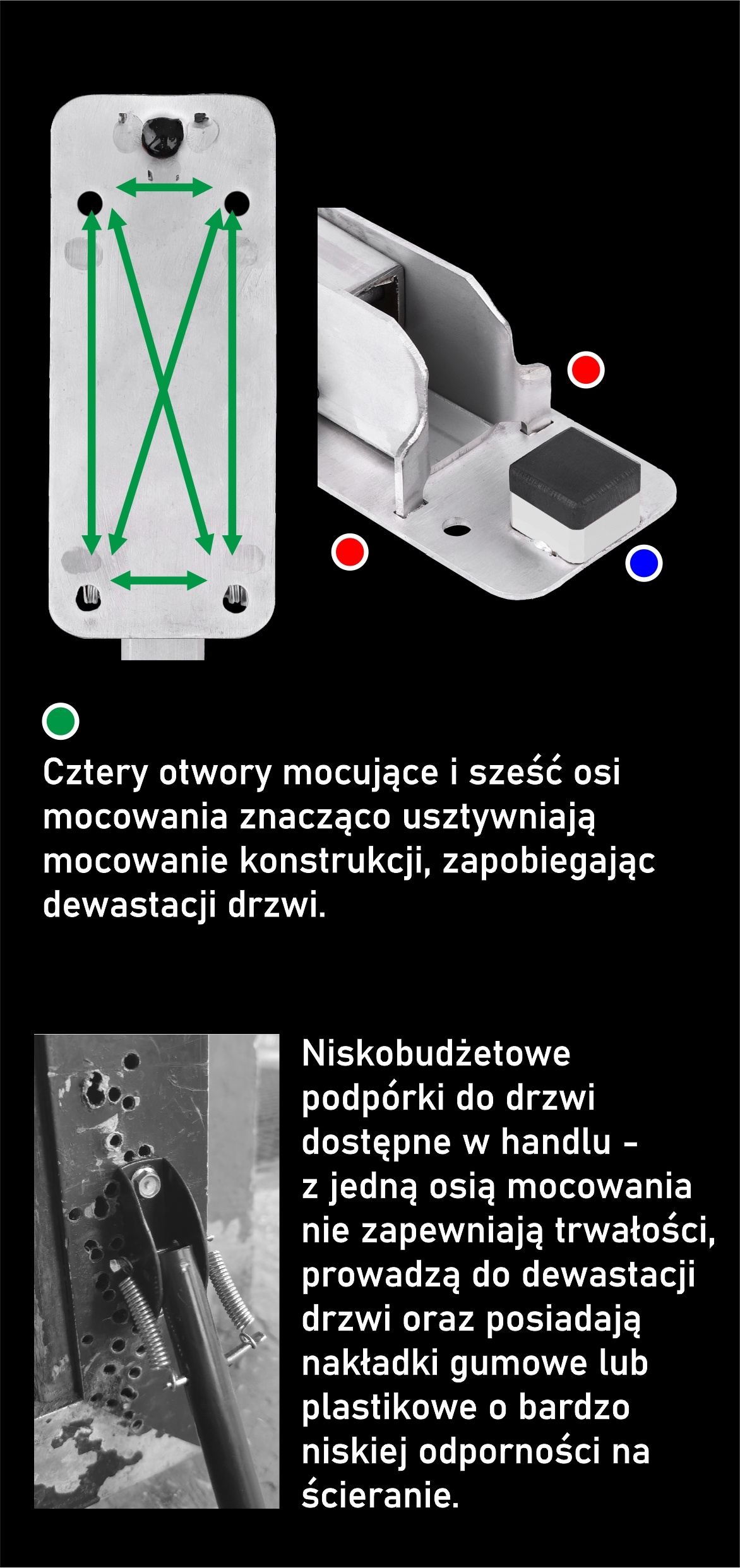 • Solidność montażu: Z czterema otworami mocującymi, sześcioma osiami mocowania i dodatkowymi zastrzałami, nasza podpórka do drzwi jest nie tylko estetyczna, ale przede wszystkim solidna, zapewniając maksymalną trwałość i ochronę Twoich drzwi przed uszkodzeniami.